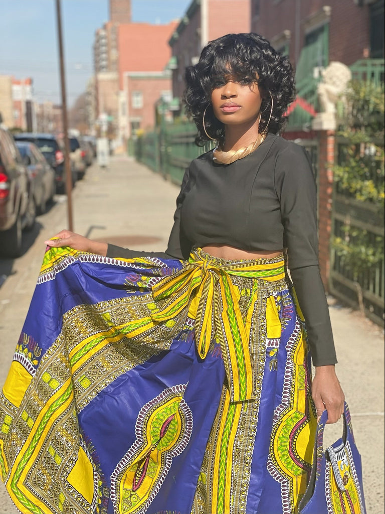 Add a new statement piece to your wardrobe! Our African Skirt Sets consists of a maxi skirt, Headwrap and bag. The skirts are one size fits all.