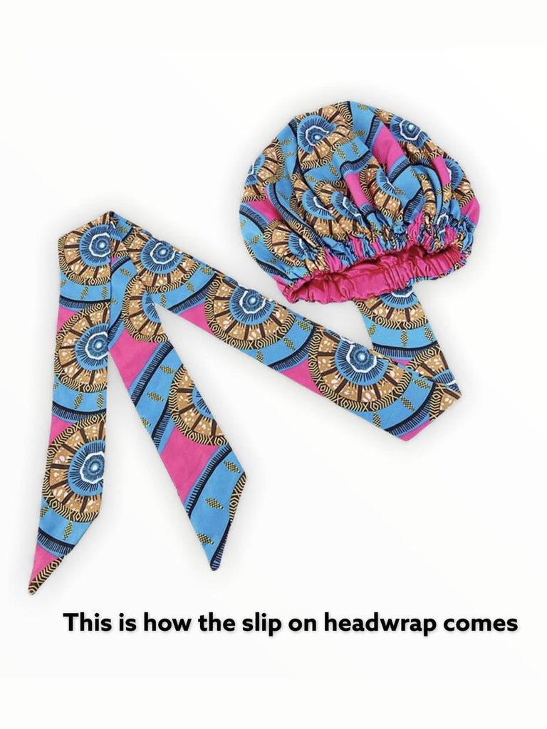 Stand out with our African Print Satin Lined Headwrap. Custom made from imported 100% premium African fabric. Simply slip it on and tie! Perfect for customers who are not able to tie a head wrap!