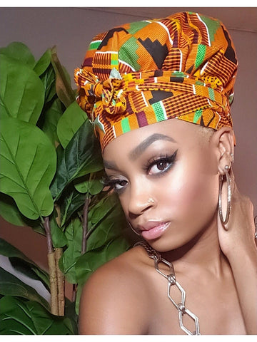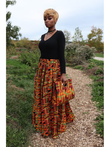 Our gorgeous African Skirt Sets consist of a maxi skirt, a head wrap, and a bag.