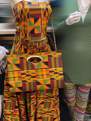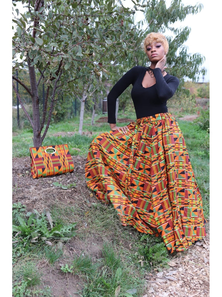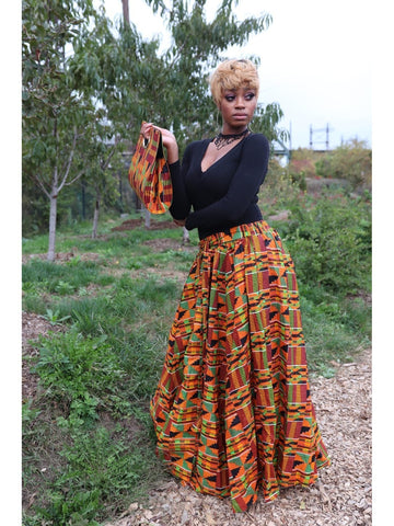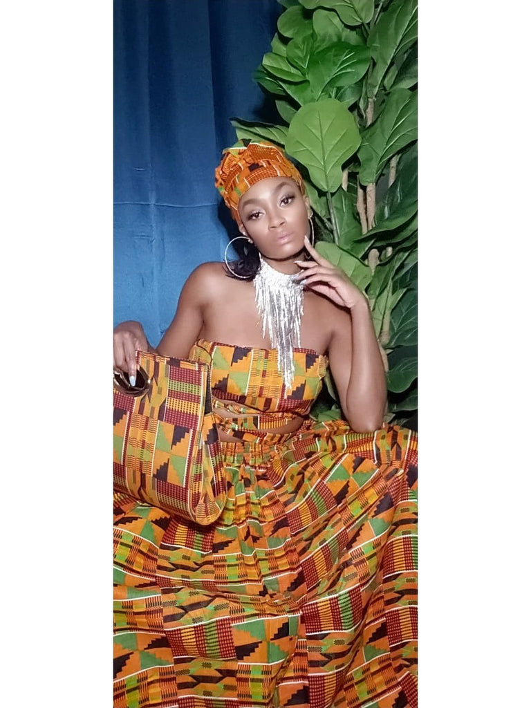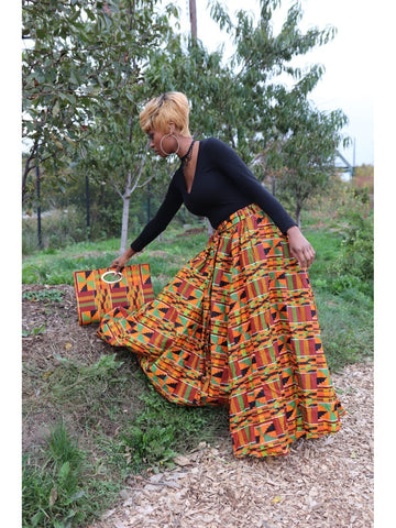 Our gorgeous African Skirt Sets consist of a maxi skirt, a head wrap, and a bag.